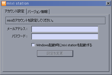 「Windows起動時にmixi stationをきどうする」にチェックをしておくと、毎回起動する手間が省けるということなんでしょうけど、さすがに聴いてる曲を常に監視されるのは厭だなあと思い、チェックを外しました。